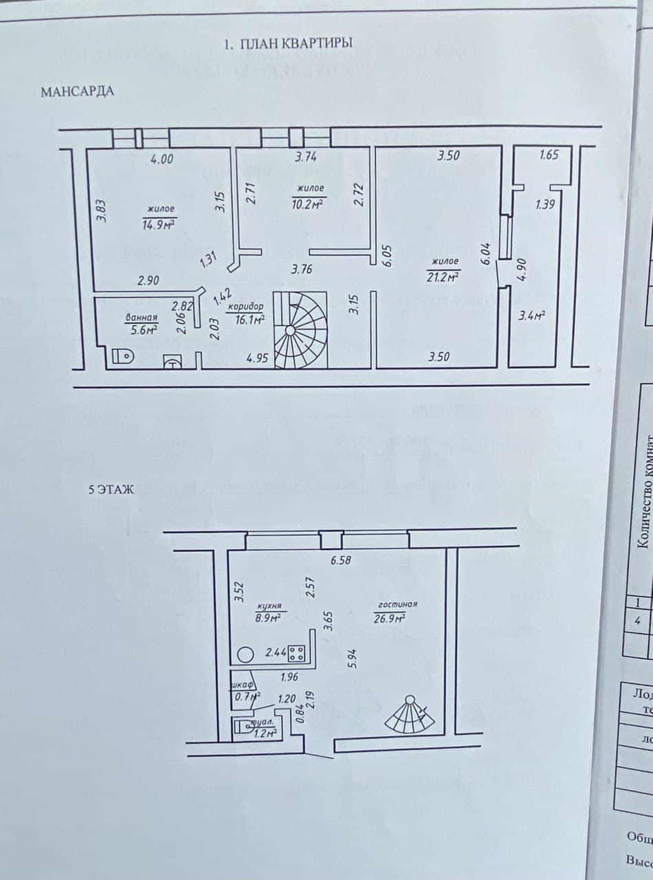 Двухуровневая четырехкомнатная квартира повышенной комфортности на верхних этажах 5-этажного кирпичного дома с мансардой 2005 года постройки в юго-восточном микрорайоне. Установлены стеклопакеты, из окон открывается вид на зеленую зону двора. Входная дверь – металлическая, межкомнатные – МДФ. Общая площадь 109,1 кв.м, жилая 73,2 кв.м. Улучшенная просторная планировка, в размещении комнат прослеживается функциональность. По плану на первом этаже гостиная 26,9 кв.м. объединена с кухней 8,9 кв.м, совмещенный санузел; в мансарде – приватное пространство, состоящее из трех спален, расположенных по разным сторонам дома, из большой спальной комнаты 21,2 кв.м. есть выход на застекленную лоджию с кладовкой, ванная комната и лестничный холл.
